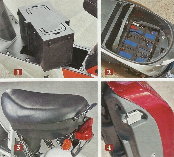 1. Аккумулятор Eltreco Sunny L — вот такой монолит, союз свинца и пластика — запирается на ключ. 2. Аккумуляторный отсек Luyuan LEV-007 внизу, батарея не извлекается. 3. Сиденье "Минска" запирается (чтобы не украли дорогой аккумулятор), багажника нет, но есть удобная ручка. 4. Если аккумулятор Luyuan RB-208 отпереть, его можно унести домой для зарядки.