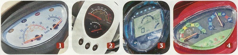1. У "приборки" Eltreco нет одометра — неудобно. 2. Приборная панель "Минска" выполнена оригинально. Плохо, что нет одометра. 3. Многофункциональный ЖК-дисплей Luyuan LEV-007. На нём есть всё необходимое, но к сожалению, показания плохо видны при дневном свете. 4. Состав "приборки" Luyuan RB-208 непривычен — слева вольтметр, справа — амперметр, спидометра и одометра нет.