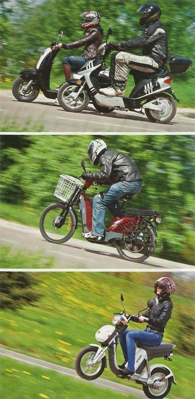 У всех испытанных скутеров динамика при трогании с места и до скорости 20 км/ ч несколько уступает 50-кубовому китайскому скутеру с четырёхтактным мотором («двухтактники» ещё резвее). «Максималка» на заряженных аккумуляторах составляет около 40 км/ч, у велогибрида — 35. В принципе, с такой динамикой среди тихо едущих в пробке автомобилей на электроскутере не чувствуешь себя ущербным. А вот в быстром потоке перебираться в левый ряд уже стрёмно — тут лучше воспользоваться «пешеходными льготами» и перекатиться по переходу. На загруженных загородных дорогах с одной полосой (общий заезд проходил в окрестностях подмосковного Нахабино) ехать с такой скоростью довольно страшно. Интересно, что под гору «электрички» не разгоняются — в «мозги» вставлена программа ограничения «максималки».