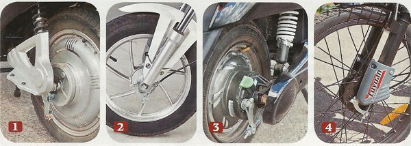 1. Мотор Eltreco запрятан в ступицу заднего колеса. 2. Очень хорошая вилка "Минска", "барабан", хоть и мал, да удал. 3. В задней подвеске Luyuan LEV-007 двухсторонний маятник. У амортизаторов регулируется поджатие пружин. 4. Большие колёса Luyuan RB-208 — хорошо, а вот передняя подвеска и тормоз слабоваты.