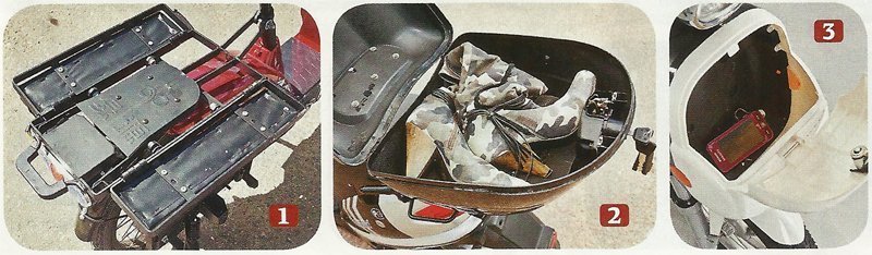 Наибольший объем багажника — под седлом Eltreco Sunny, однако мотошлем туда не войдёт, даже самый открытый. Чуть меньше места под седлом Luyuan LEV-007. Минский же щёголь позволяет положить небольшой багаж лишь в передний кофрик. Зато на тяжеловесе Luyuan RВ-208 можно увезти мешок с картошкой, или пассажира, если раскинуть багажник. Однако потайных запирающихся объёмов у него нет.