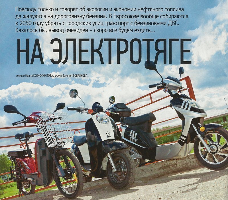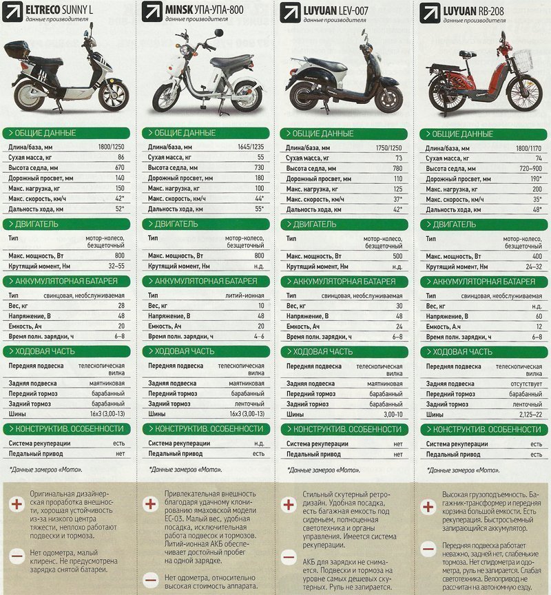В Китае уже несколько лет электроскутеры стремительно вытесняют с улиц своих бензиновых собратьев, да и в Европе никого ими не удивишь. Однако на нашем рынке «экономичные и экологичные» пока не прижились, кроме нескольких моделей велогибридов и редких электроскутеров. Аргумент продавцов весомый: нет спроса. А нет его потому, что, во-первых, наше законодательство (в отличие от того же Китая) никак этот спрос не стимулирует, а, во-вторых, параметры ввозимых машин («максималка» и дальность «боя»), мягко выражаясь, хреновенькие. Виной тому свинцовые аккумуляторные батареи — тяжёлые и малоёмкие. У литий-ионных параметры лучше, но и цена соответствующая. Однако стоять в стороне от будущих трендов негоже, поэтому мы решили протестировать несколько сравнительно популярных моделей и одну новинку из Минска, производство которой стартует уже в июле. Итак, встречайте: Luyuan LEV-007 — китайский электроскутер с внешностью ямаховского ретробестселлера Vino, спроектированный в Европе с нуля и производимый в Поднебесной Еltгесо Sunny L, Minsk Упа-Упа 800 — перепевка ямаховской «электрички» ЕС-03 и «тяжеловес» в ряду велогибридов Luyuan RB-208.