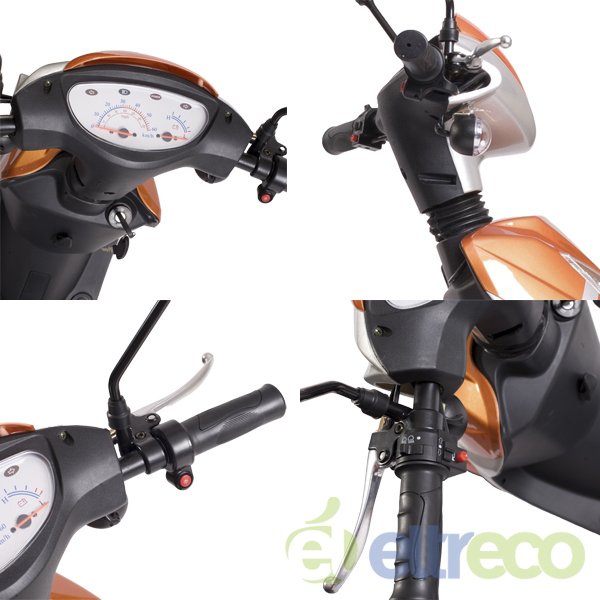 Приборные панели моделей одинаковы и наглядно показывают скорость, уровень заряда, а также намекнут вам, что вы забыли включить сигнал поворота и дальний свет. За работу заднего тормоза отвечает левый рычаг тормоза на руле, за работу переднего — правый рычаг. Включатели поворота, дальнего и ближнего света фар, порядок работы замка зажигания и его функции абсолютно схожи с их бензиновыми собратьями. Нет только кнопки стартера. Поэтому, если придётся пересесть на электроскутер с бензинового — у вас не возникнет проблем с переобучением и привыканием к нему.