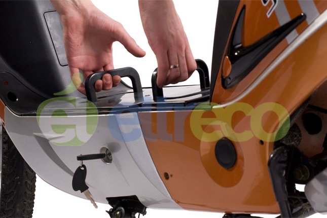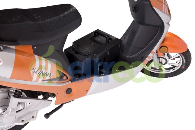 Аккумулятор легко снимается, например, для зарядки в домашних условиях или для замены на запасной. Для удобства извлечения, АКБ оснащён двумя ручками. Вы также можете заряжать АКБ не снимая с электроскутера. Для этого нужно один конец зарядного устройства подключить к гнезду подседельного ящика, а другой — в розетку 220 вольт. Время зарядки аккумулятора составляет 4–5 часов.