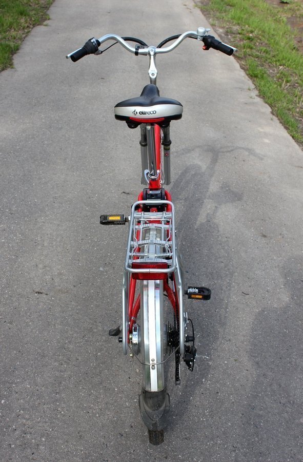 За эти деньги мы получаем алюминиевую раму, 26-дюймовые колеса, амортизационную вилку, складные педали, двойные обода, пластиковые крылья, багажник (вес до 15 кг), звонок, флягу (до нас она почему-то не доехала) и зарядное устройство. Передний тормоз ободный (v-brake), задний — барабанного типа. Угол наклона руля и высота седла регулируются. Количество передач — 7. Вес — 26 кг. Страна-производитель — Китай, хотя бренд Eltreco изначально австралийский.