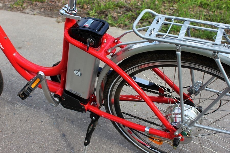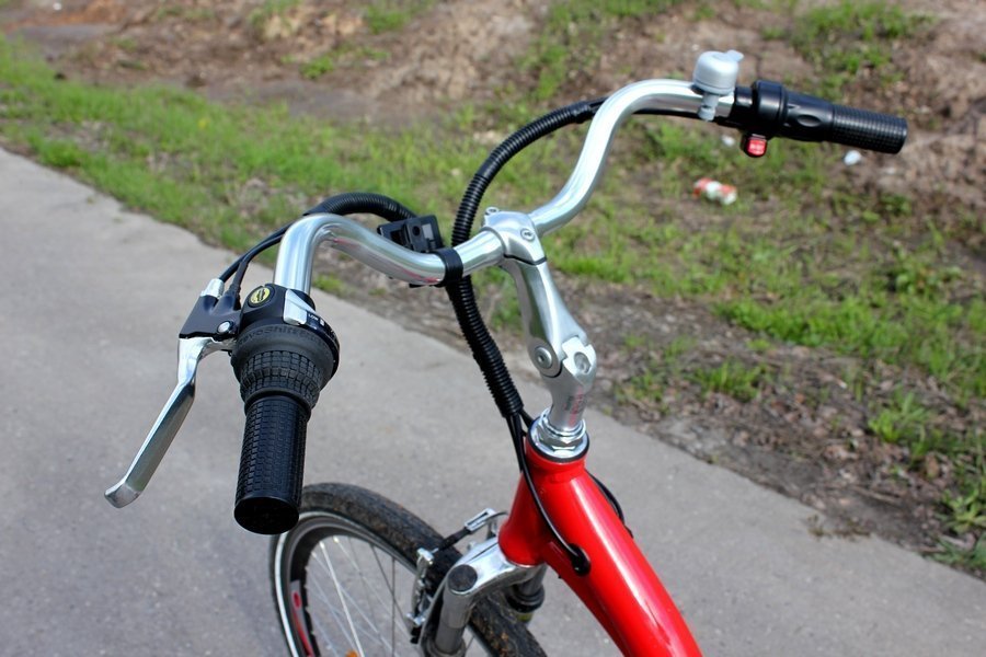 Чтобы «завести» велогибрид, нужно вставить ключ в замок зажигания, повернуть вправо на 60 градусов, нажать красную кнопку на правой ручке и вперед. Этой же кнопкой можно включать/отключать мотор, а прибавлять газ — с помощью приспособления возле правой грипсы (как в скутерах и мотоциклах). С левой стороны находится переключатель скоростей.