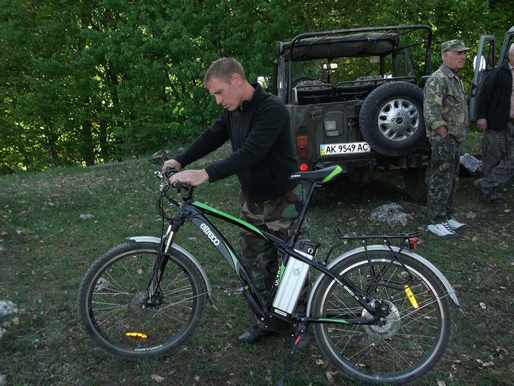 Увидел у московских ребят, которых поднимал на плато Караби-Ялла красивый необычный велик. Рассказали о нём много интересного, дали прокатиться. Ничего особенного. У нас в горах мотоциклы ценятся, даже скутеры используют с толком. Бензин, конечно на Украине дороговат, на российские деньги получается 40 руб. за литр. Это единственная причина, по которой такой аппарат смог бы заинтересовать меня. Да и дороговат. Зарплаты на Украине не такие большие, так что долго копить придётся. Прокатился немного в гору, с горы, ощущения обычные, как на мопеде с педалями. В горах особо не наездишься на простом велосипеде, здесь нужен только горный. А у ребят и горный, и с электромотором. Хитро!