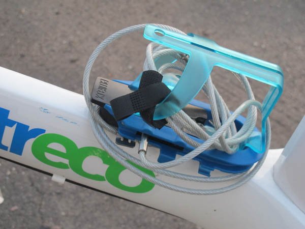 На «Вольте» установлены два противоугонных троса. Зачем их два вскоре становится понятным: одним пристёгивается байк к парковочной решётке, а вторым, на всякий случай, замыкается заднее колесо и легкосъёмное сиденье (на парковках я видел, как владельцы, заперев ведлосипед, снимали сиденье и уходили с ним). Понятно, такие тросы не для длительного хранения, и проблему оставления дорогого байка они не решают.