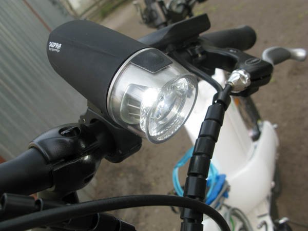 Световых приборов на «Вольте» в штатной комплектации нет, кроме фонарика на руле и полоски красных светодиодов на аккумуляторной батарее. Эти светодиоды хорошо видны сзади, когда они загораются при торможении. К сожалению режим постоянного горения, как габаритов, не предусмотрен. Передний фонарик — в обрезиненном герметичном корпусе, с пятью светодиодами, создающими мощный поток лучей. Фонарик легкосъёмный — нажав на защёлку его можно унести при длительной парковке. Питание (4 батарейки типа АА) крайне удачно: во-первых, тип АА имеет гораздо большую ёмкость, чем обычно применяемые в фонариках пальчиковые ААА. Но главное — использование 4 штук а не 3, как обычно в светодиодных фонариках, позволяет купив аккумуляторы, их без проблем подзаряжать. Дело в том, что зарядные устройства рассчитаны на 2 или 4 батареи, и с зарядкой 3-х пальчиковых всегда проблема.