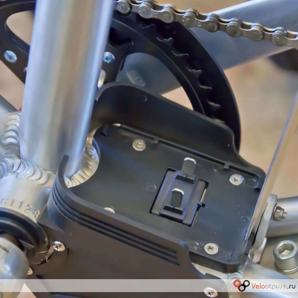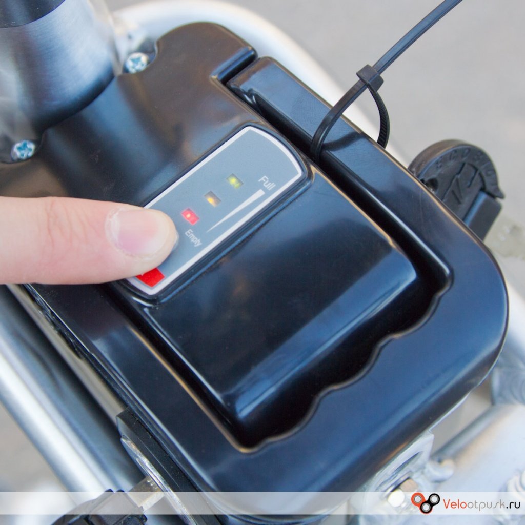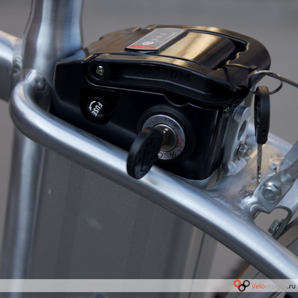 Из интересных особенностей — ключ, без которого не получится включить аккумулятор или снять его, и индикатор заряда, при помощи которого можно быстро проверить уровень заряда. Срок службы аккумулятора — 3 года или 1000 циклов зарядки — вполне обычно для литиево-ионного элемента питания.