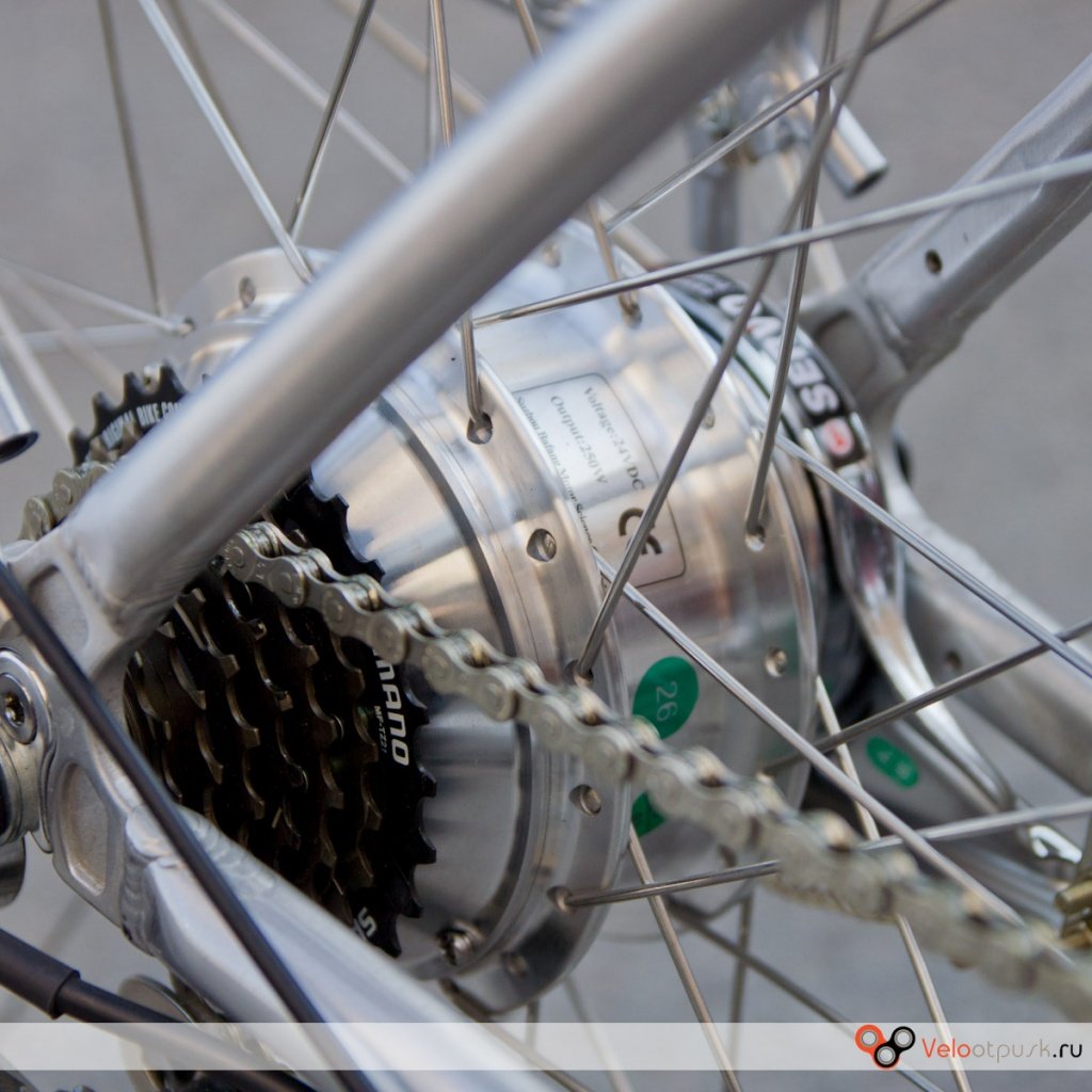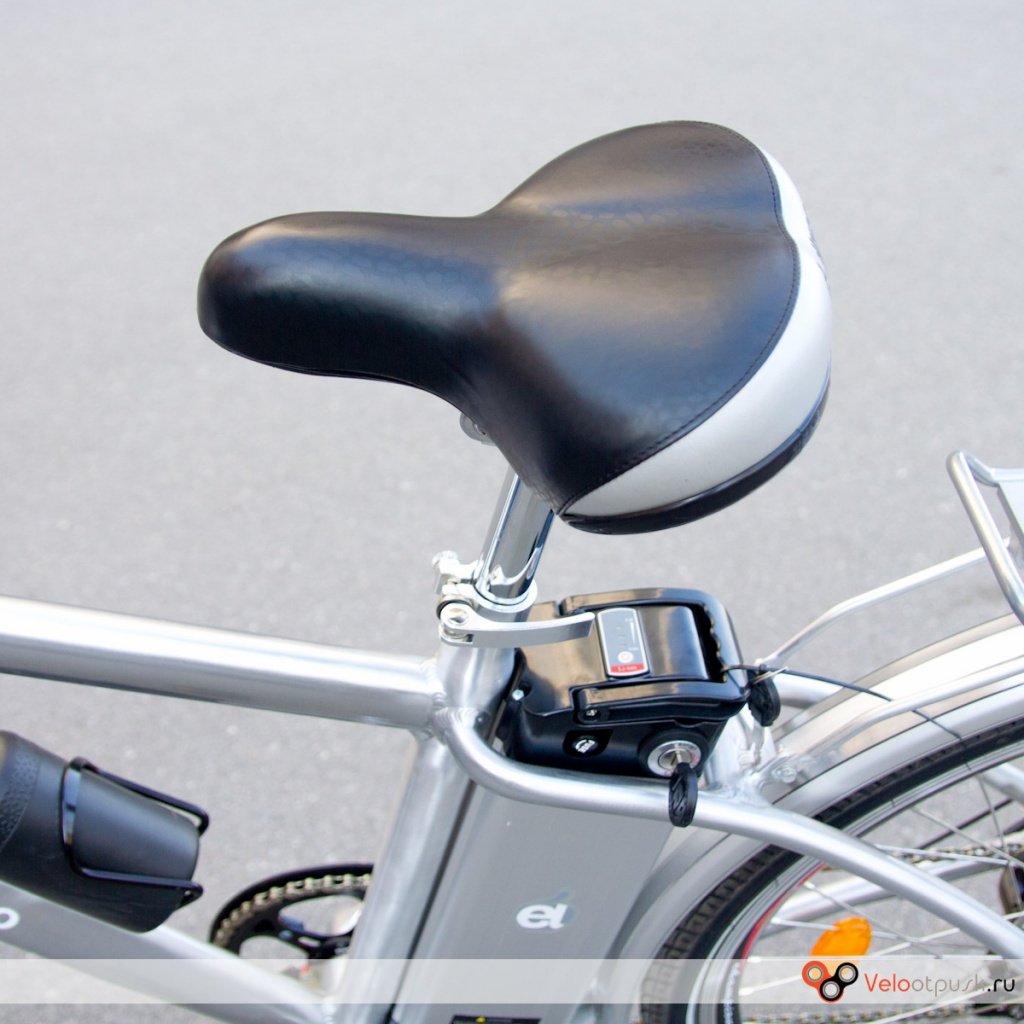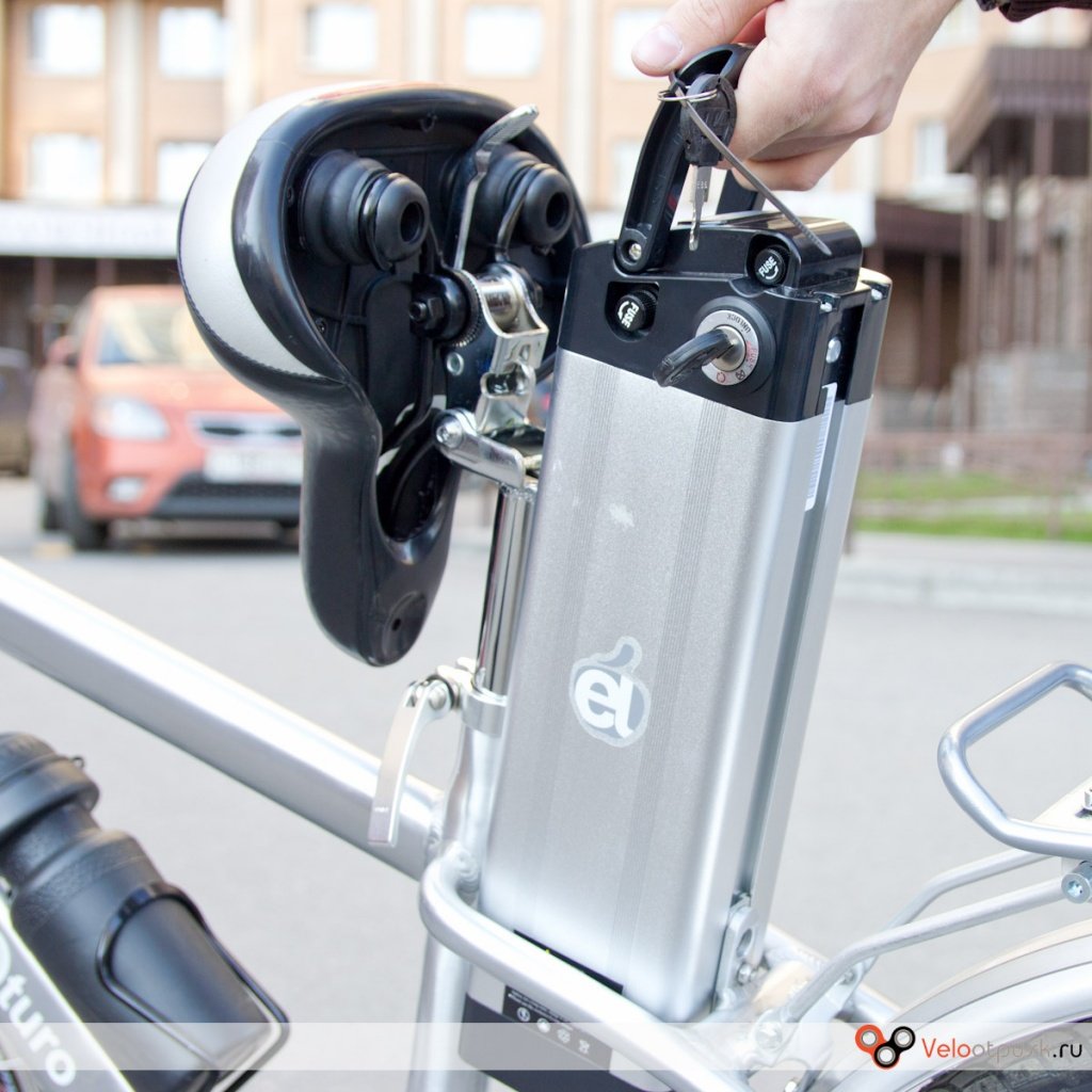 На первый взгляд это обычный городской велосипед, ничего особенного. Примечателен только непонятный ящик со вставленным в него ключом, расположенный прямо за подседельной трубой. Это литиево-ионный аккумулятор, электрической ёмкостью 10 Ач, напряжением 24 В, от которого питается электродвигатель велосипеда.