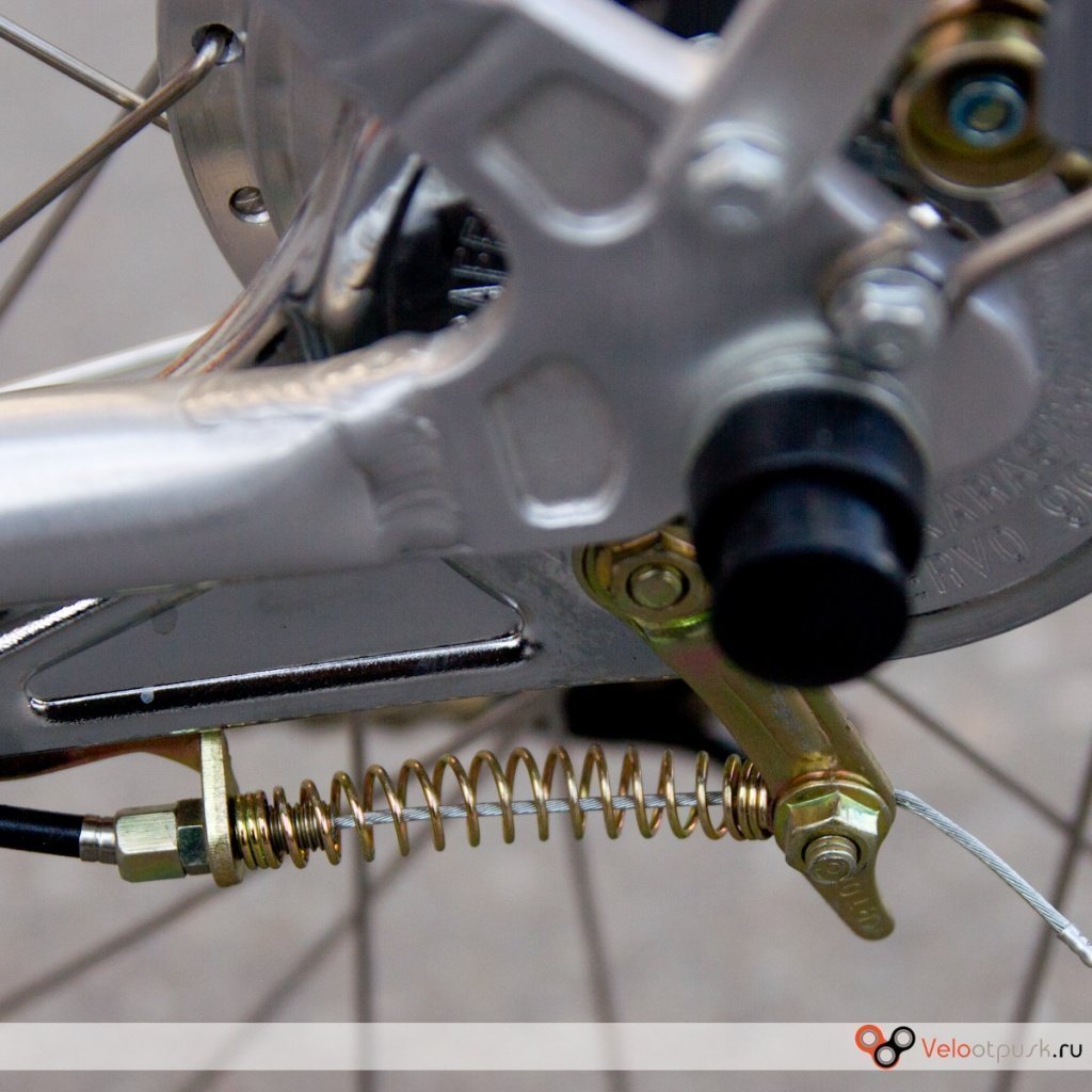 В остальном же Eltreco Turo — обычный городской велосипед с компонентами начального уровня. Передний тормоз — механический дисковый, задний — барабанный. Весьма посредственная амортизационная вилка с ходом 50 мм, задний переключатель так же самый простой — Shimano Tourney. Из атрибутов городского велосипеда — багажник, который выдерживает до 15 кг, подножка, металлические крылья с брызговиками, широкое седло и руль с регулируемым выносом. Обода на Eltreco Turo двойные — но это скорее необходимость, чем роскошь, ведь сам по себе велосипед весит около 26 кг.