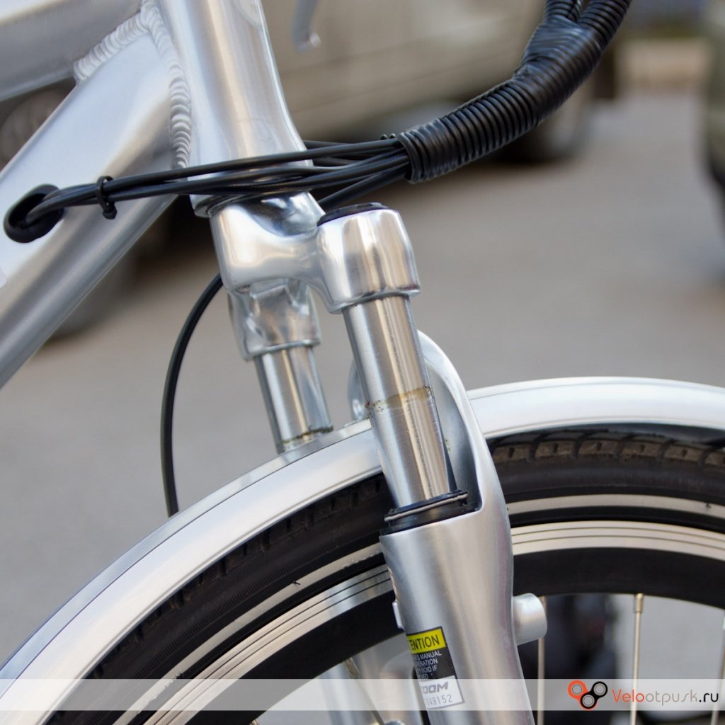 Впрочем, если отбросить в сторону электрическую часть и обратить внимание на то, как во время езды ведут себя различные узлы велосипеда, то в бочку радости и позитива немедленно примешиваются ложки разочарования. Как и ожидалось, очень простая вилка «пробивается» почти на каждой неровности с характерным неприятным ухом звуку, который поддерживают своим дребезжанием и металлические крылья — звукового комфорта при езде даже по незначительным ухабам ждать не приходится. Работа тормозов очень нечёткая — задний тормоз или сразу блокирует колесо, или не тормозит совсем. А для того, чтобы заставить работать передний тормоз, приходится очень сильно зажимать его ручку. Такая неэффективная работа тормозов наблюдается при скоростях выше 20 км/ч. Если учесть, что электромотор разгоняет велосипед до 30 км/ч, то этот недостаток можно считать весьма существенным. Но зато продуман момент, при котором велосипедист одновременно нажимает тормоз и «газ» — в этом случае электромотор отключается.