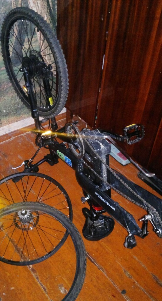 Я уже упоминал , что в нём очень много так называемых неподрессоренных масс. На деле это превращается в зубодробительную вибрацию и тряску на любых неровностях. На препятствиях посерьёзнее, типа бордюров или ям средней величины, пробивало вилку, а заднее колесо со звуком «хрясь» пробивалось до обода. Поэтому сразу же смутили колёса. Мне велогибрид уже достался с восьмёрками на обоих, и, я думаю, они будут усугубляться (достаточно одного неудачного бордюра, корня или ямы). Надо ставить усиленные обода. Однозначно. Но это сложно, ибо надо переспицовывать колёса. Так же первым делом я поменял седло на большое и подрессоренное, ибо моя пятая точка отказалась повторно садиться на прежнее.