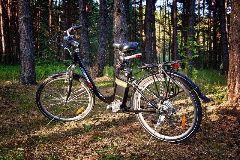 Первая поездка. Вернувшись из гаража, я сразу же поехал на пикник в лес. При этом у меня был тяжёлый рюкзак с фотоаппаратом, инструментами, насосом и всякой мелочёвкой. На багажнике разместились туристические коврики, а на руле сумка с двумя двухлитровыми пакетами сока. На руле пакет оказалось везти не очень удобно, в поворотах я задевал его ногой. Поэтому в поворотах я не крутил педали, а ехал на двигателе. По лесным дорожкам ехать было легко, но вот по песочку на узких колёсах проехать непросто. Тут опять на помощь пришёл двигатель. Аккуратно регулируя газ, я смог преодолеть все песчаные преграды.