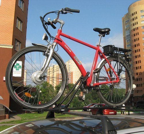 Другой вариант перевозки — крепление на крышу. Максимальный допустимый вес традиционных велокреплений 17–20 кг. Ограничение это довольно условное, т.к. момент силы, действующий на велокрепление и разрушающий его, сильно зависит от положения центра масс велосипеда, а также от ровности дороги. Мой Dutch M без блока аккумуляторов весит 22 кг. Если вынуть подседельный штырь с седлом, тем самым уменьшив вес на 1 кг и понизив немного центр масс, то по асфальтовым дорогам перевозить велогибрид можно смело. По грунтовым дорогам, когда корпус автомобиля раскачивается из стороны в сторону, лучше не рисковать.