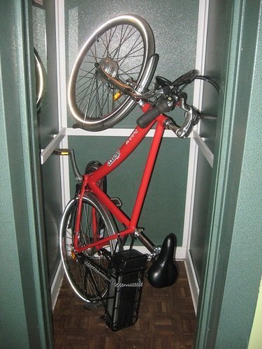 Последнее испытание весогабаритов — перевозка на пассажирском лифте. Подъём велогибрида «на дыбы» не сложнее, чем обычного велосипеда: блок аккумуляторов частично уравновешивает мотор-колесо. Заднее полноразмерное крыло с брызговиком позволяет установить велогибрид вертикально, но всё же брызговик подминается, и нужно быть аккуратным, чтобы не его поломать. Первый заход оказался неудачным: высокий руль выпирает на несколько сантиметров и не даёт закрыться дверям. Со второй попытки удаётся найти правильное положение в кабине — поехали.