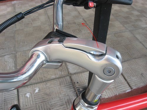 На первых 50 метрах, на пути от склада до автомобиля, обнаружилось, что задний тормоз работает всего лишь процентов на 10 от нормы. Ладно, дома отрегулируем. В багажник Qashqai с разложенным задним седлом велогибрид в собранном виде немного не влезал — слишком высокий руль. Не хватало нескольких сантиметров. Чтобы снять переднее колесо нужен ключ на 18 мм — не самый ходовой размер. Возвращаться к механику не хочется. Немного поразмыслив, обнаружил, что крепление руля к выносу не на болтах, а на эксцентрике, который также отвечает за фиксацию угла наклона выноса. Открыв этот эксцентрик, удалось удобно разместить велогибрид в багажнике.