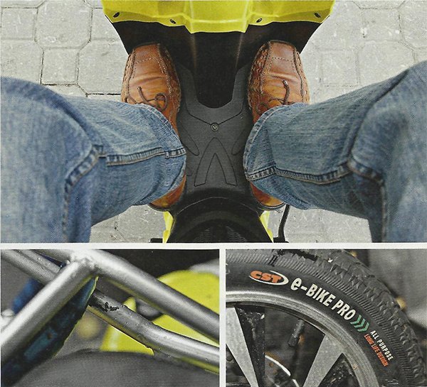 Ходовая часть «чайки» более-менее приспособлена для перемещения по городу. Точнее, для вялого передвижения по гладким дорогам. 16-дюймовые колёса неплохо компенсируют примитивность подвесок, «проглатывая» трещины и ямки асфальтового покрытия. «Плюшевая» рама активно им в этом помогает. Угол наклона рулевой можно регулировать, причём в движении: достаточно просто потянуть руль на себя или наоборот немного оттолкнуть и рулевая колонка меняет своё положение в пространстве, сопровождая это мелодичным похрустыванием пластика. Внешне электроскутер выглядит вполне достойно: и панели аккуратные, и зазоры ровные. Спереди — крючок для сумки, под седлом — багажная ёмкость, куда поместится велосипедный шлем.