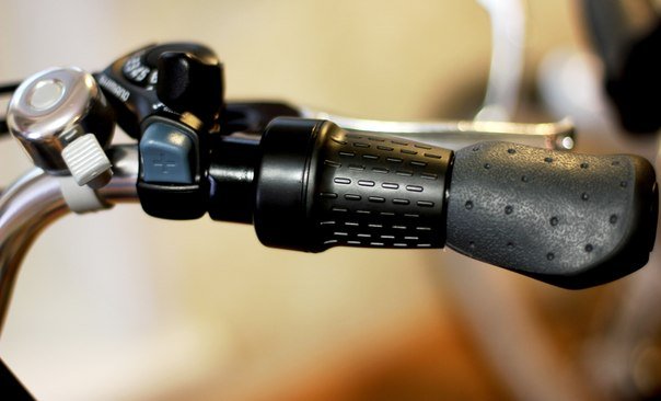 Ручка газа. Один из самых удобных вариантов, встречающихся на велогибридах. Слева — переключатель скоростей.