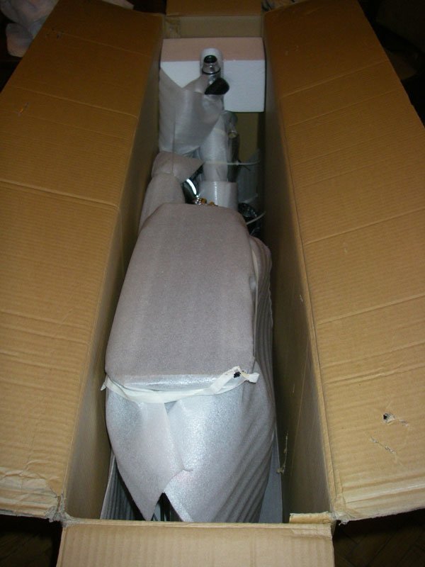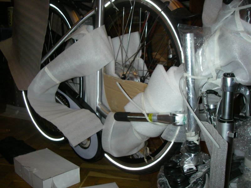 Всё в коробке завернуто в большое количество пенополиэтилена. Велосипед без переднего колеса, седла, руля и педалей. Ещё отдельно переднее крыло. Весь крепёж вкручен в раму.