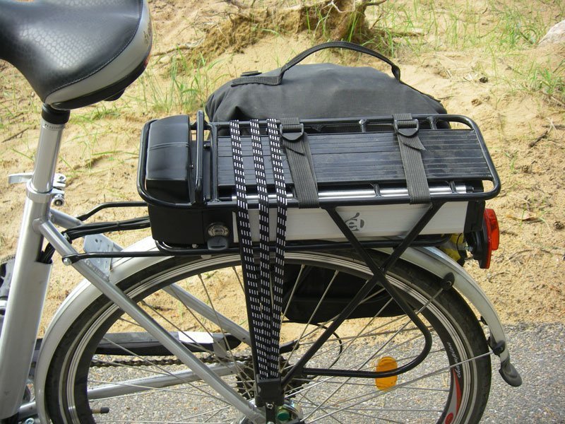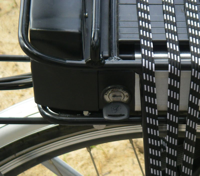 Первое, это вставка заряженной батареи — для неё есть специальная полка в багажнике над задним колесом. Батарея туда довольно плотно вставляется и закрывается на ключ. Этот же ключ — своеобразный «замок зажигания». Для активации электрической части велосипеда нужно повернуть ключ в положение «вкл». Зарядное устройство взял с собой. В комплекте с велосипедом, как я упоминал, идут инструменты. Все они лежали в сумочке, которая как специально подошла для зарядного устройства.