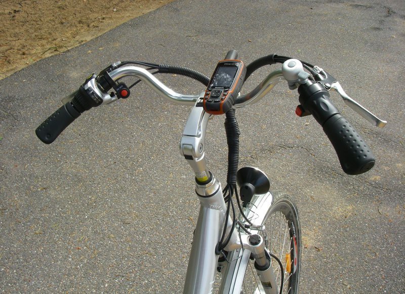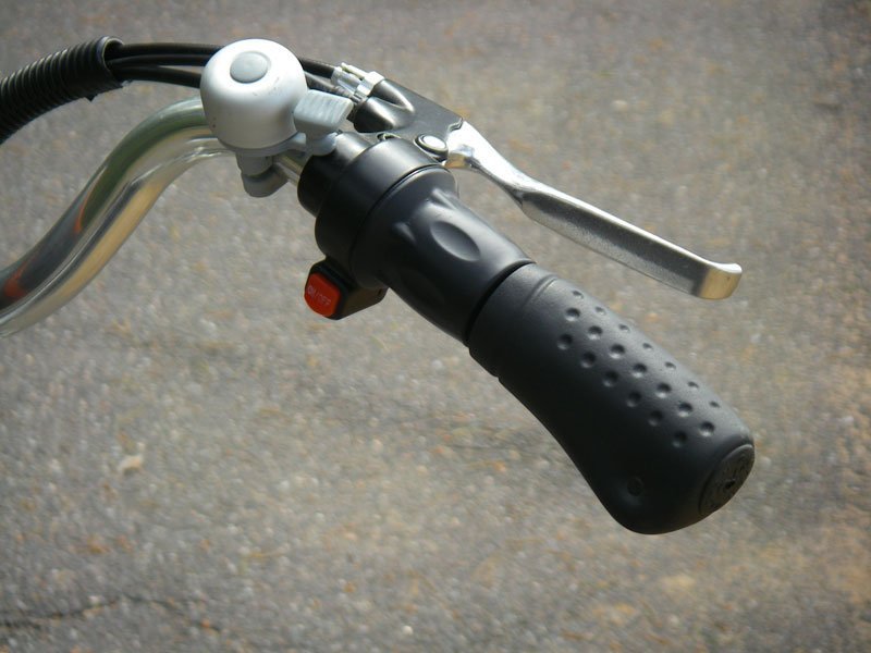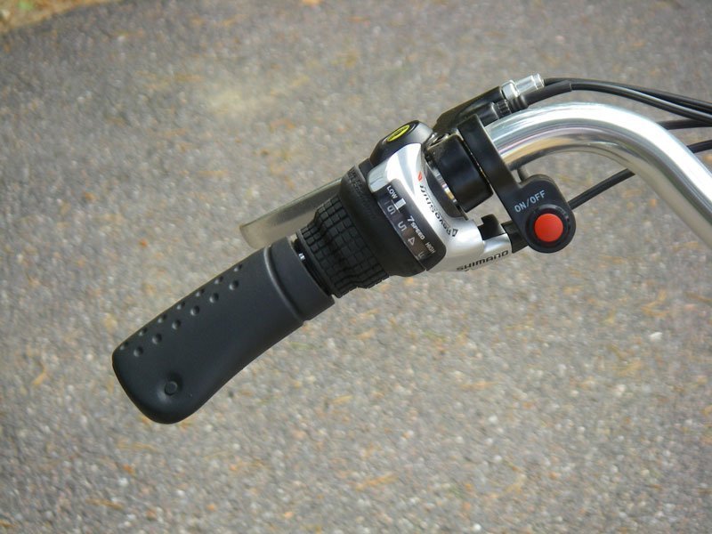 Вытащил велосипед на улицу. Первое впечатление — непривычное расположение органов управления. Обычно на велосипеде справа находится манетка заднего переключателя и рычаг заднего тормоза, слева монетка переднего переключателя и рычаг переднего тормоза. Тут же всё наоборот, как на мотоцикле. Справа вместо манетки «ручка газа» мотоциклетного типа, её надо «крутить», и рычаг переднего тормоза. Слева же манетка заднего переключателя и рычаг заднего тормоза. Так как манетка заднего переключателя установлена слева, её пришлось просто перевернуть «вверх ногами», благо с RevoShift это можно проделать. Теперь цифры, обозначающие передачи, «стоят на голове» и крутить манетку надо в другую сторону. Справа ещё имеется кнопка включения двигателя, а слева есть кнопка для включения фары и заднего габарита. Я обратил внимание, что к тормозным ручкам подходят провода и в них явно есть концевые выключатели. Сначала я думал, что это включатели стоп-сигнала, а потом понял, что это отключение тяги двигателя при торможении.