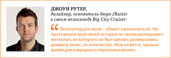 Было бы странно, если бы повальное желание изобретать велосипед обошло стороной дизайнеров. Не стал исключением и американец Джоуи Рутер, несколько лет назад задумавшийся о создании компактного городского байка и с тех пор потерявший покой и сон. В портфолио Джоуи около десятка различных моделей, но один из главных бриллиантов его коллекции — Big City Cruiser (1). Дизайнер лишил велосипед части рамы, избавил от цепи, звёздочек, амортизаторов и ещё нескольких неважных для городского денди деталей, зато оснастил 36-дюймовыми колёсами.