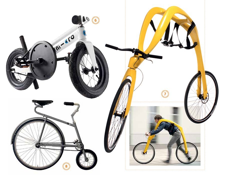Редкие представители отряда двухколёсных, имеющие счастье в наш рациональный век не задаваться практическими вопросами, — раритетный Velocino от итальянской Abici (8), точная копия модели 1930 года за €600, и мобильная конструкция под названием Fliz Bike (7), про которую невозможно не рассказать подробнее.