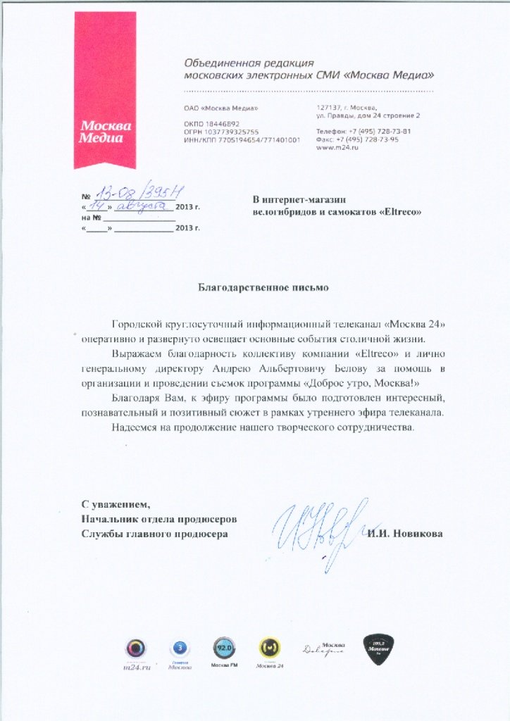 Наша компания прикладывает огромные усилия для популяризации велогибридов, которые для многих уже успели стать символом здорового и активного образа жизни. Мы участвуем в праздниках и фестивалях, активно сотрудничаем с различными СМИ. И, конечно, всегда приятна любая положительная оценка прилагаемых усилий. Как, например, вот эта благодарность от телеканала «Москва 24». Со своей стороны мы всегда готовы к работе с любыми СМИ, которым небезразличны вопросы экологии, здоровья людей и современные технологии в области транспорта.