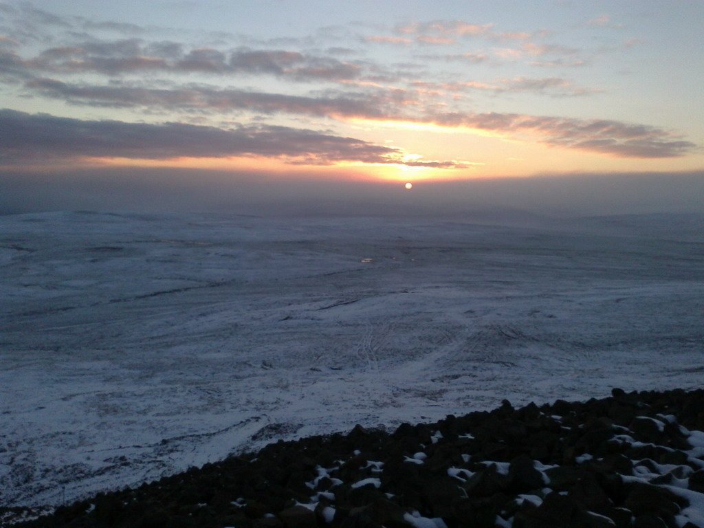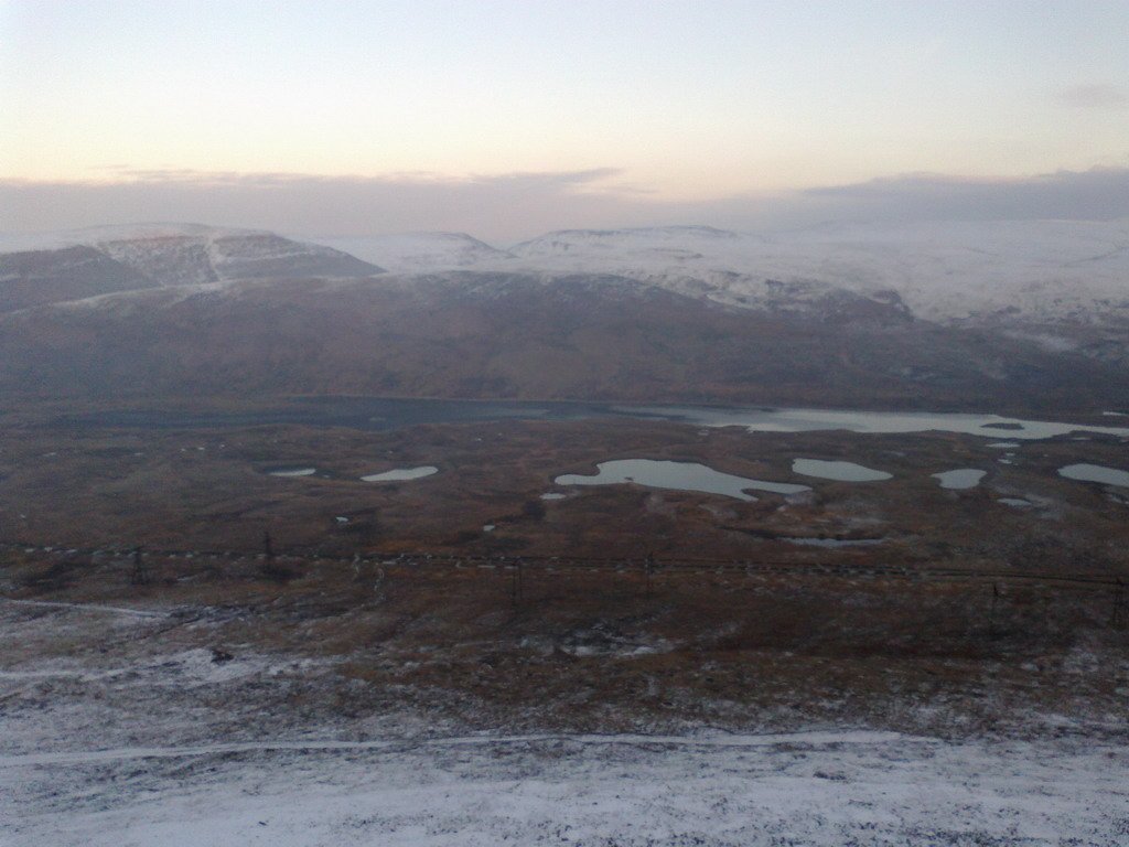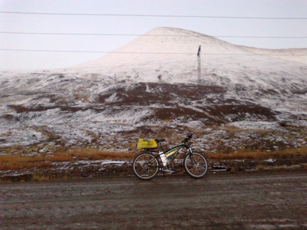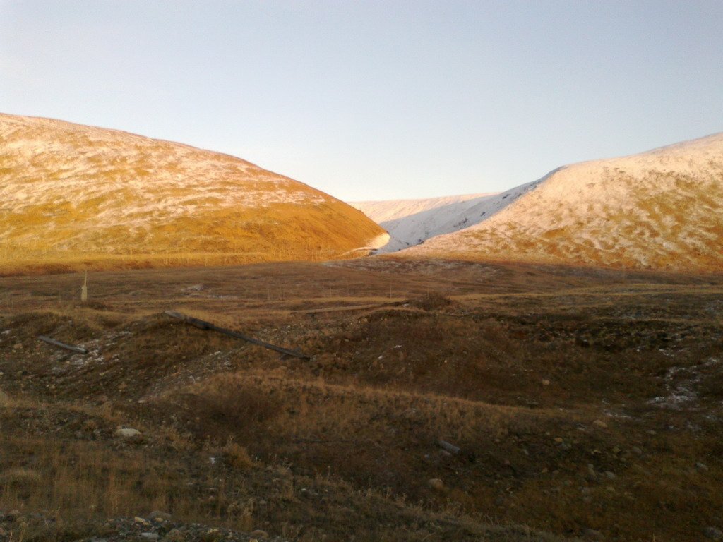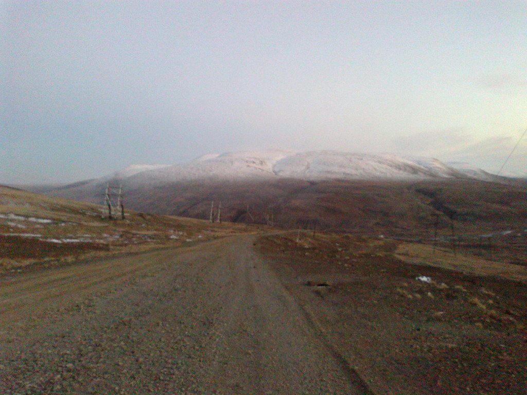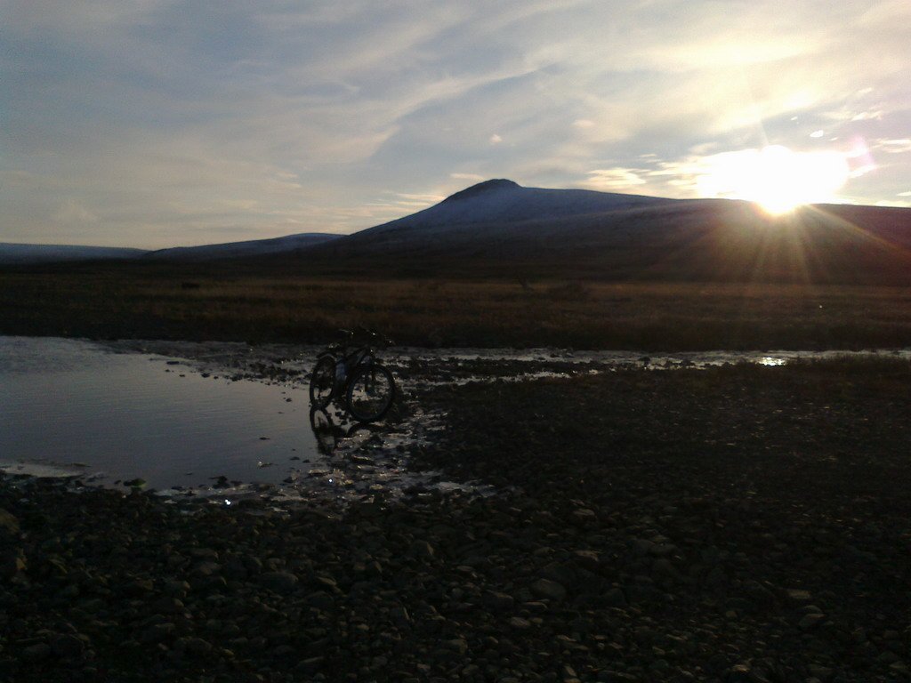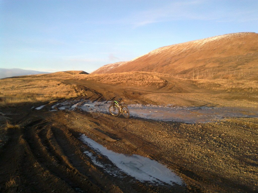 Решил 20-го вечерком поехать до Ергалахских озёр. Цель — отдохнуть, побыть на природе, сфотать борьбу осени и зимы, то есть осенний контраст, нечастое природное мгновение, которое я так люблю! После водозабора, где бункера, кружили пару сов, так и хотели меня атаковать. Приближались до 1 м, но я решил их отпугнуть ярким фонарём, световой поток 900 люменов, дальность 200 м (9-е этажи освещает очень ярко). Дальше, где дорога идёт возле горы Острой, уже хорошо подмёрзли лужи. Ехать стало проще, правда после р. Ергалах, вода попала на тормоза и они временно перестали работать и как раз на спуске! Затормозил ногами, потом разработал тормоза, но воду всё равно опасался. Ночью было –6 °C. Яркая луна, звёзды, всё как в сказке. Только снова совы начали кружить возле меня, на этот раз уже 3 их стало! Снова фонарь в деле + палка на всякий случай. Одна покружила и летит прямо на меня, палка на готове (фонарь отключил), но в двух метрах от меня, сменила траекторию полёта и улетела! С собою теперь всегда у меня три фонаря в походах. Один на веле, второй налобный, для палатки например, то есть ближнего света. Другой солнечная панель, хватает на 5 часов при полной зарядке, заряжается от солнца или USB. От USB идёт зарядка 5 часов, от солнца 15 часов. Как вариант для палатки тоже хорошо, угол охвата света почти 90 градусов, да и днём зарядить можно и батарейки не нужны (также от панели можно заряжать мобильники и пр.). Выспался хорошо и 21-го отправился покорять гору Острую пешком. В долине ещё нет снега, но горы уже хорошо припорошило. Пошёл по дороге. Которая идёт почти до вершины. Смотрю, следы зайца и ещё кого-то. Не знаю, собаки или песца. Но шаг между большими лапами 150–180 см и это в гору. Бедный зайчик, не позавидуешь... Кто за ним гнался, можно только судить. Но не волк видимо, у того лапы вообще огромные. Поднялся на гору, заснял фото и видео и пошёл обратно. Днём было +2, а под утро уже –9. Ночью метрах в 10 от меня пробежал заяц, беленький красавец, но убежал быстро, не удалось сфотать, хоть и луна ярка, далеко успел убежать. Вот думаю, не привёл он бы сюда компанию, например того, кто бежал там за зайцем, а у него такую компанию привлечь легко получится! Снова яркая луна, звёзды, северное сияние, идеально проходит отдых и тишина! Кстати, днём прямо почти атаковали меня птицы, на этот раз маленькие, вроде воробьёв по размеру, приближались на полметра и ближе, так резво, небольшой стаей! Но быстро улетели. У птиц прям любовь ко мне! Благо никаких четырёхногих не встретил и это радует (заяц не в счёт, я про хищных)! Вторую ночь спалось ещё лучше, покушал и собрался в путь. Но встречный ветер был приличный и не радовал, да земля раскисла от солнца, ехать было сложно. То вода попадёт на тормоза и замёрзнет. Набрал воды в реке Ергалах, не много проехал, а она на багажнике, смотрю, а там уже лёд. Два дня и две ночи на природе, масса положительных впечатлений от окружающей среды и катания на веле. Хотя накатал и не много, всего 54 км. В этот раз серпантин покорился сложно из-за сильного, встречного ветра. Максималка на спусках была 46,9. Средняя скорость пути обратно 10,6 км. На обратном пути встретил ребят, ехали двумя машинами с реки Дудинка. Точнее слияния рек Чибичете и Дудинка. Одна УАЗик на триколовых колёсах, а другая вообще красавица, огромный болотоход, как Саня (вроде так его зовут, с первого раза на имена не очень