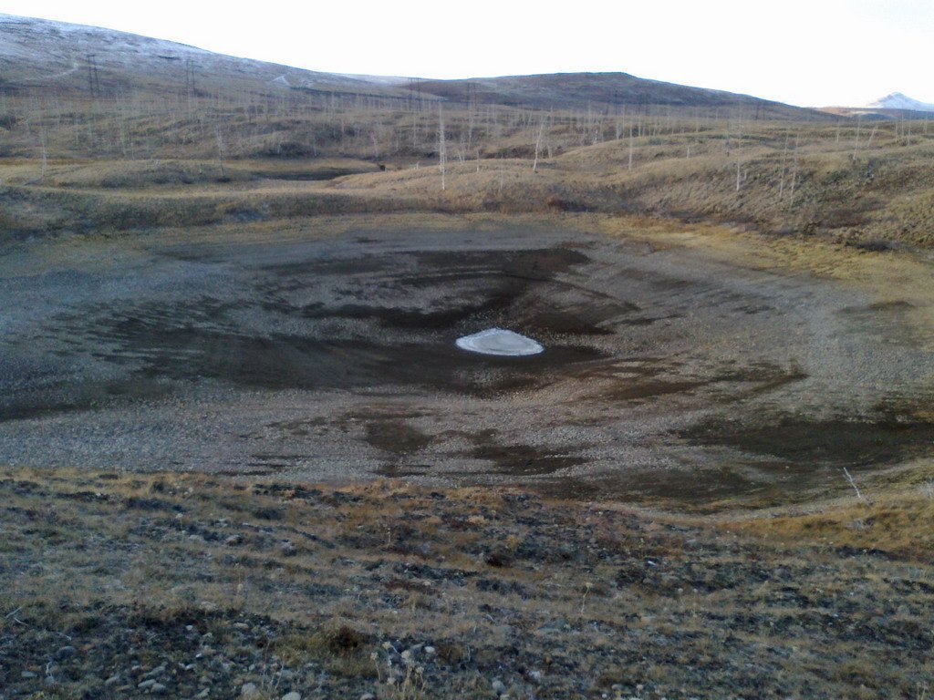 Маленькое озерцо обмелело. Да и лёд, только булыжником пробьёшь. Не большой камень отлетает.