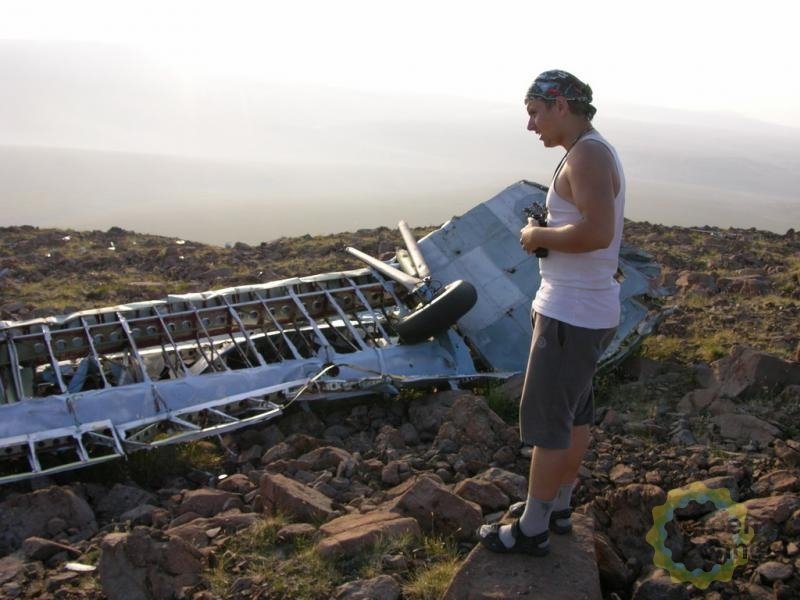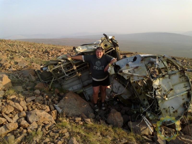 Путь был через кусты, потом два спуска и основной подъём, уже по камням. С дороги, перед горой, обломки самолёта были видны в бинокль, как мне и говорили, западный склон горы. Но я не думал, что обломки лежат на высоте 610–635 м! Поэтому был солидный подъём, но не крутой, а продолжительный. Что-то я думал, что мой навигатор в телефоне работает только с интернетом, а так обычно и есть, но там нет связи. А навигатор включился, поэтому смог узнать высоту, где мы находимся. Координаты по широте, где находится самолёт 69’02. Обломков много и им уже 26 лет будет в августе (крушение 1987.08.17). Сделали фотосессию и решили покорить и гору, так как оставалось подняться всего 130 м. Но... На высоте 660 м мы повстречали лису! Тут стало ещё веселее. Зверь ходит вокруг нас и не уходит. Пытался спугнуть сигналом охотника, но она не уходит, близко не подходит, держится на расстоянии! Мы идём вверх и она за нами. Остаётся метров 20 до вершины, наклон очень большой и камни осыпаются. Сергей было дело не хотел покорить вершину, но я пошёл вверх. Позже и Сергей поднялся, говорит, лиса совсем близко подошла. Поднялись мы с запада, а спускаться там совсем небезопасно, поэтому начали искать нормальный спуск, а он оказался с юго-запада, даже ближе к югу. Пофоткались на горе, дымка мешала нормально всё заснять дали...