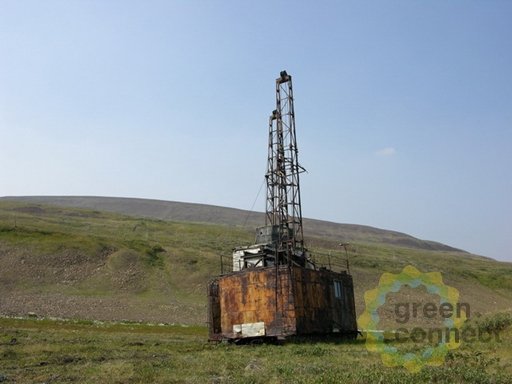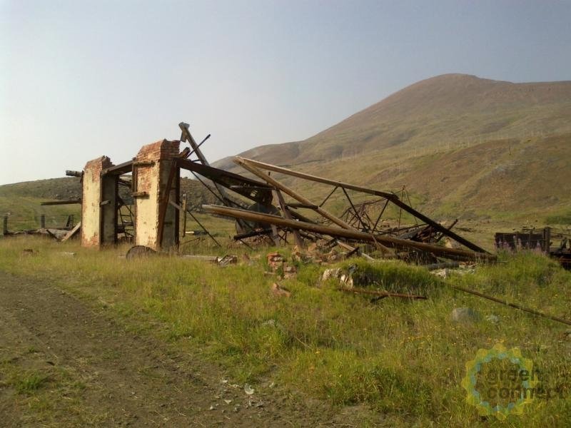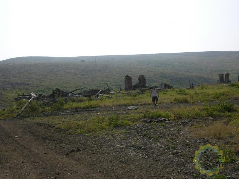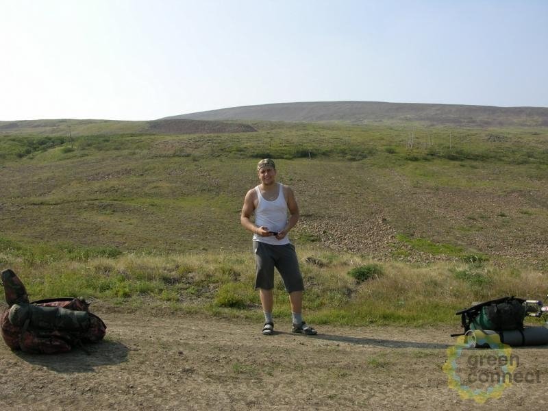 В районе горы Круглая появились давно заброшенные буровые. По всей видимости (и следам), их перетащили с г. Чёрной. Территория теперь вроде как принадлежит ”Русской Платине”, как мне сказали, указом Медведева. Поэтому всё лишнее убирают, как буровые, так и балки. Прекрасная погода сопутствовала хорошему настроению и поездке. Броды и земля высохли, земля потрескалась, ехать было намного проще, чем когда я там был раньше. Воды мало, реки Средний Омнутах и Омнутах, почти высохли, бегут маленькие ручьи, не более 50 см шириной. Доехали до трактора, который за рекой Омнутах. На тот период уже прошли сутки и на этом направлении мы не встретили ни одного человека и машин! И это в выходные! Хорошо подходящие места для разной живности, в том числе и хищной. Пофоткались возле трактора, оставили велики и рюкзаки и пошли на гору Кулгахтах. Я, правда, рюкзак взял, но только со всем необходимым.