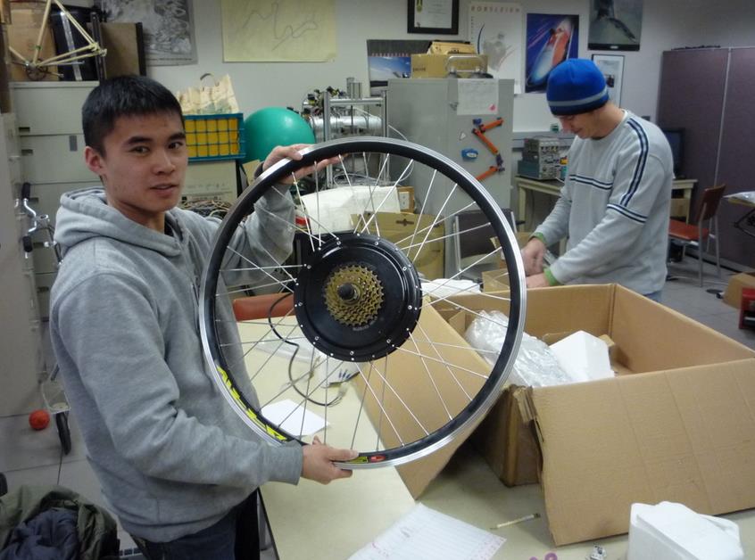 Установка этого двигателя в переднее колесо весьма проста. А если вращать педали, получится полноприводный велосипед. Поклонники такой конфигурации сообщают, что двигатель в переднем колесе придает велосипеду устойчивость на скользкой дороге, но при этом при подъеме в гору по мокрой дороге электровелосипед скользит больше, чем с двигателем в заднем колесе.