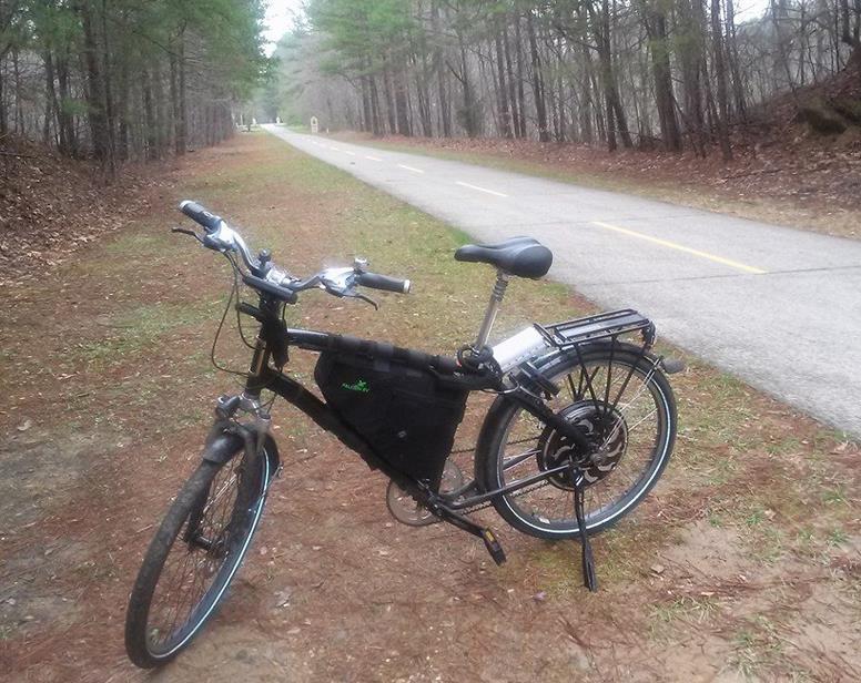 На фотографии электровелосипед с 66-вольтным задним мотор-колесом. Батарея расположена в средней части велосипеда в треугольной сумке Falcon EV