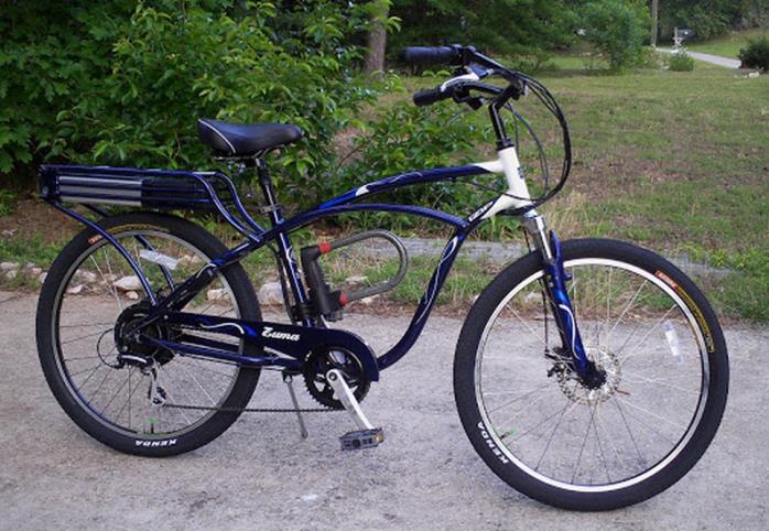 Если батареи разместить на раме, электрический велосипед будет лучше развесован и управляем при движении. Двигатель 10T MAC при напряжении в 48 В обеспечит максимальную скорость в 45 км/ч на ровной поверхности, велосипед при этом весьма хорошо преодолевает некрутые подъёмы.
