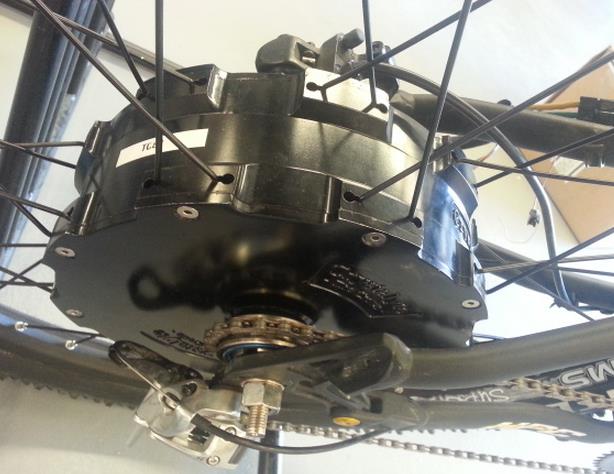 Редукторный мотор-колесо Bafang BPM среднего размера в заднем колесе. Батарея также размещена сзади, поэтому центр тяжести у этого велосипеда смещен, что делает его плохо управляемым. Однако форма рамы позволяет установить треугольный отсек для батарей, что коренным образом перераспределит вес и улучшит управляемость велосипеда.