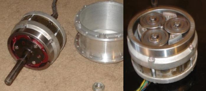 Важным преимуществом такого мотор-колеса является низкая цена и тихая работа. Такие двигатели часто поставляются с 20-амперными контроллерами, но при смене контроллера на 25-амперный и 30-амперный наблюдается значительное увеличение ускорения. Что касается массы меди, как правило, в таких двигателях устанавливается статор с катушкой шириной 28 мм. Если вы ездите по ровным дорогам, останавливаясь редко, можете наслаждаться необычайным ускорением при нагрузке в 40 A хоть каждый день (пока выдерживает ваша батарея). Но если вы достаточно долго преодолеваете крутые подъёмы, даже при 30 амперах двигатель может сгореть. Любая сила тока выше предельной приведет к выделению большого количества тепла, что неэффективно и рискованно для велогибрида.