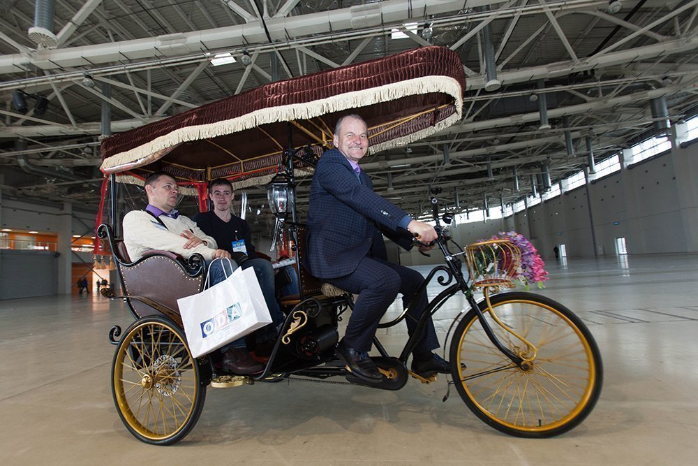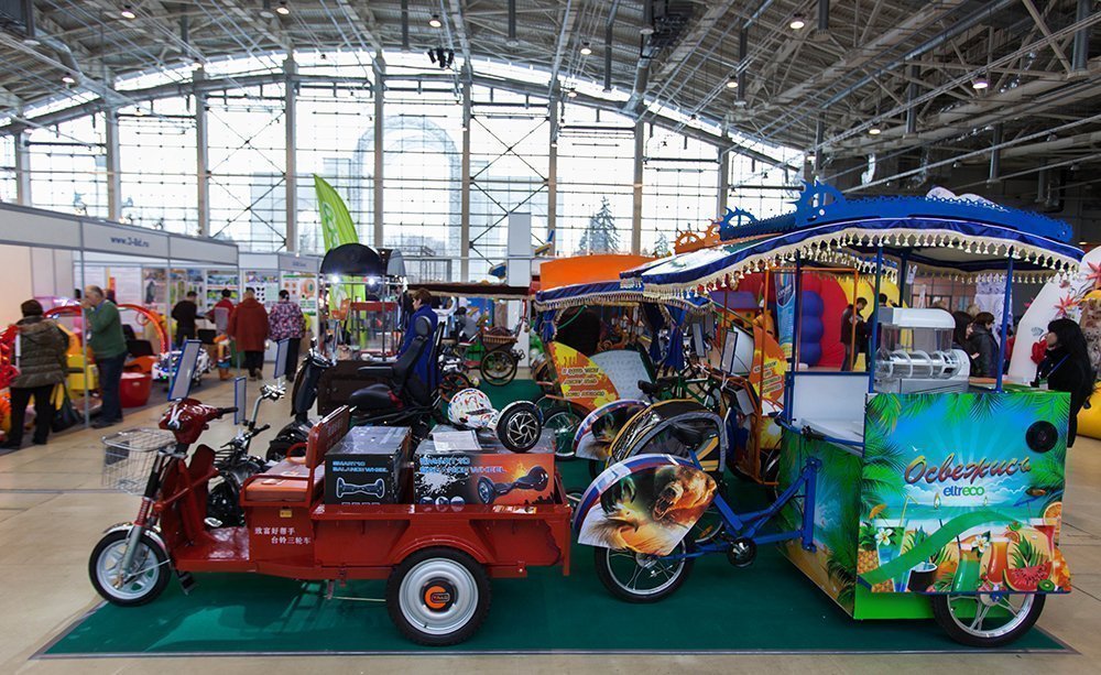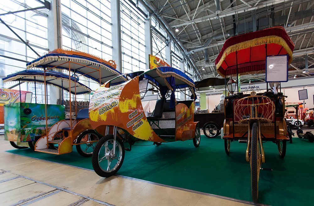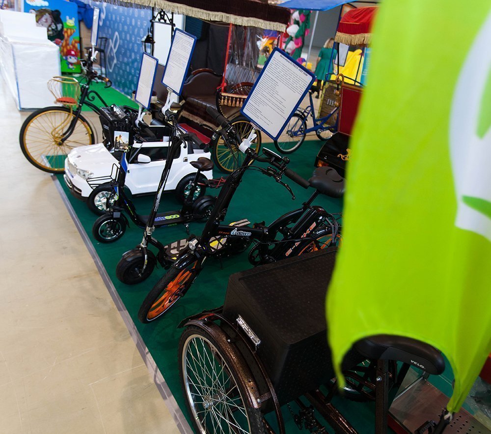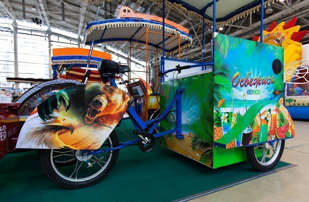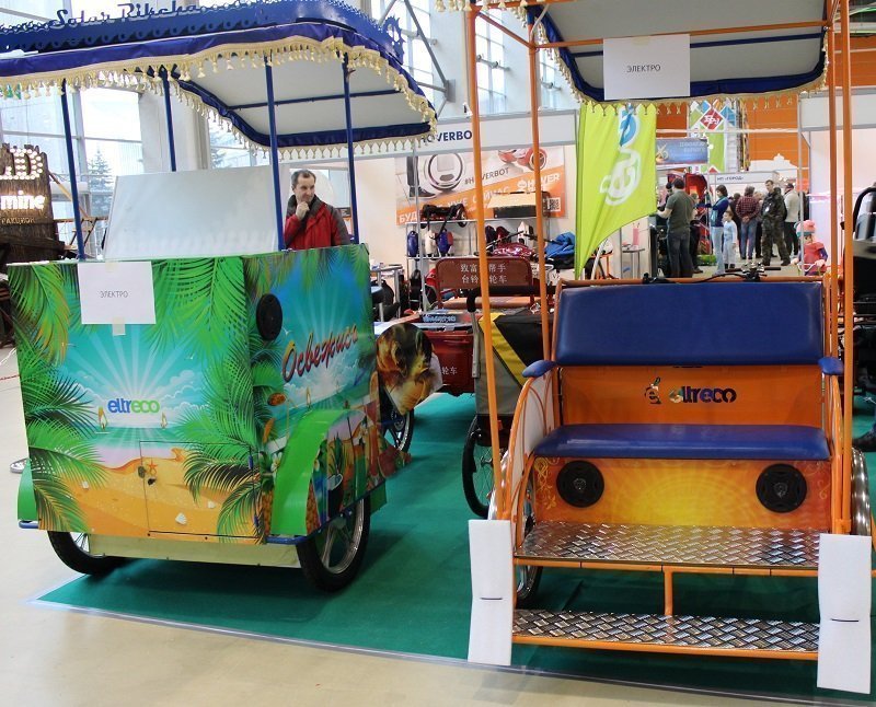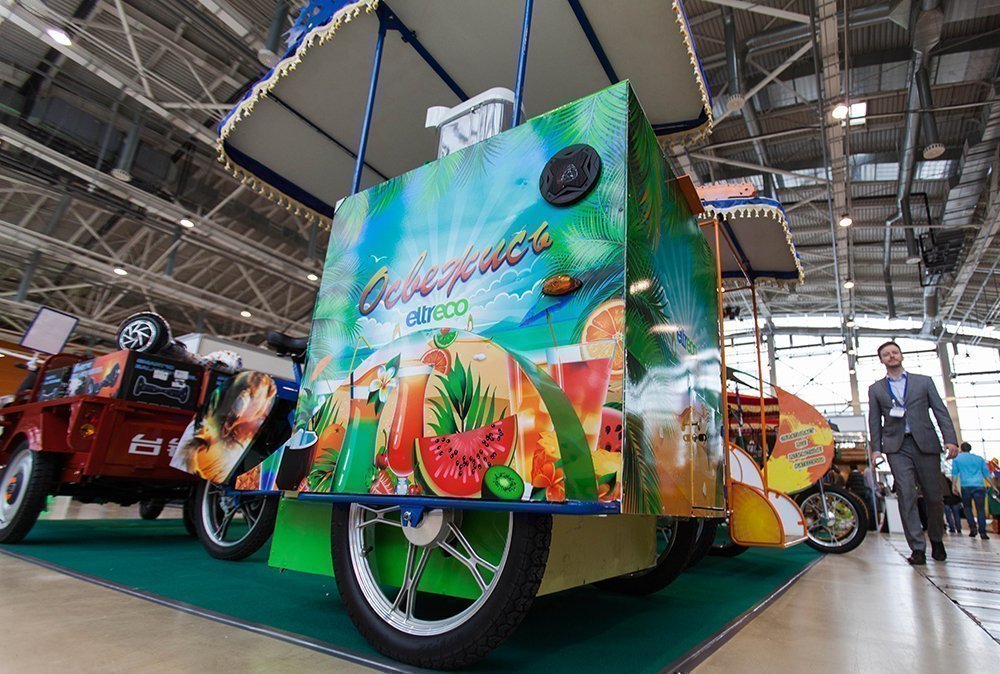 В локации компании Eltreco на выставке основной упор был сделан на разнообразные модели электровелорикш. Этот уникальный, экономичный и экологически чистый электротранспорт способен стать идеальным и доступным вариантом для использования в качестве мобильных точек продаж или организации прокатного бизнеса.