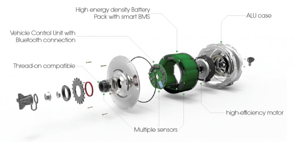 Zehus BIKE+ — это инновационный «всё-в-одном» продукт, представляющий собой компактный безщёточный hub-мотор мощностью 250 W со встроенной батареей, контроллером, сенсорами и интерфейсом Bluetooth. Благодаря усилиям инженеров команды компании, все необходимые компоненты велогибрида собраны в алюминиевом корпусе ступицы заднего колеса диаметром 180 мм и шириной 120 мм. Встроенная 30-вольтная литий-ионная аккумуляторная батарея ёмкостью 160 Wh и вес всего лишь 3 кг дают BIKE+ самое выигрышное соотношение энергия/вес на рынке.