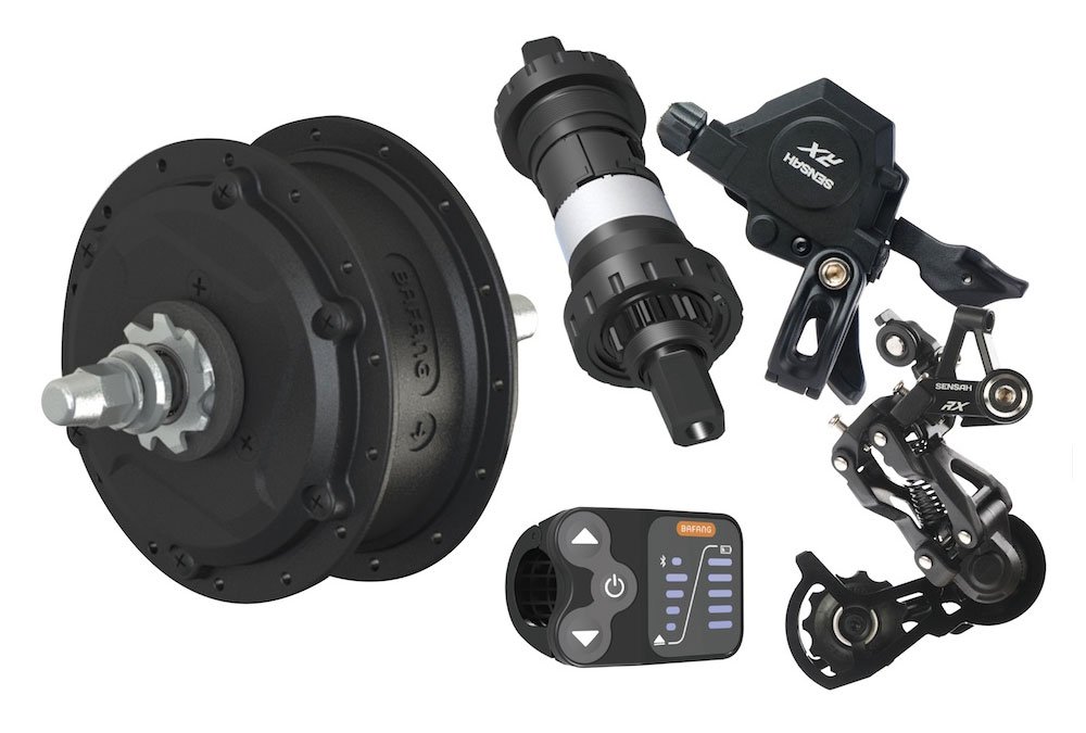 Одна из новинок, электродвигатель Bafang RM G353, представляет собой hub-мотор со встроенным планетарным редуктором и компоненты для переключения передач. Двигатель под дисковый тормоз мощностью 220 W и весом всего лишь 2,4 кг соответствует распространенному стандарту крепления задней оси (OLD 120 мм), который можно встретить на многих моделях складных велосипедов. Специальная кассета звёзд с конфигурацией 9-13-17 зубьев управляется задним переключателем и трёхскоростным триггером Sensah.