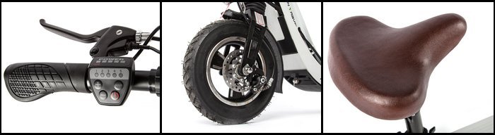 Также комфорта добавляет удобное кожаное сидение, которое, также как и руль, легко отрегулировать по высоте за счёт надёжных и прочных эксцентриков, расположенных на рулевой втулке и подседельном штыре.