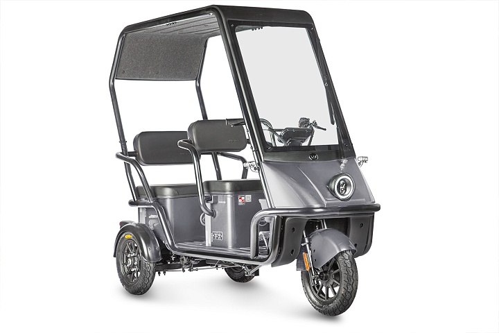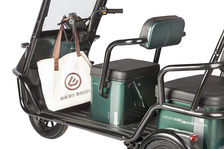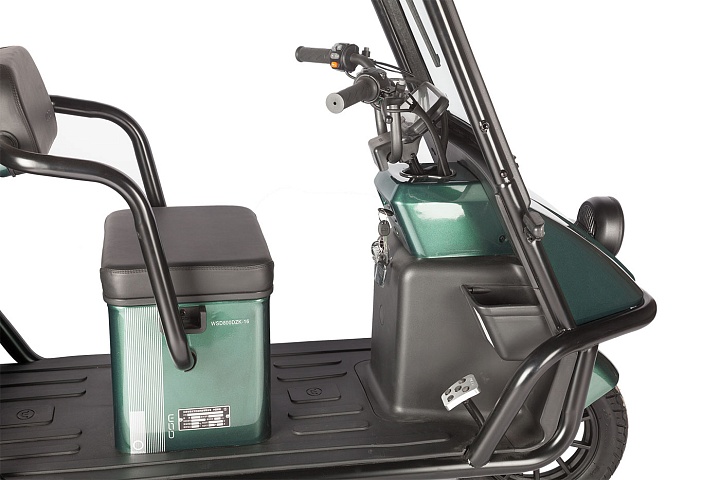Трицикл рассчитан на двух человек, что делает его отличным выбором для совместных поездок. Удобные сиденья с мягкой спинкой обеспечивают комфорт как для водителя, так и для пассажира. Под задним сиденьем находится просторный багажный отсек, где можно разместить покупки, сумки или другие необходимые вещи.