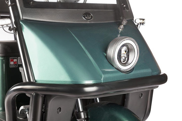 Большие зеркала заднего вида обеспечивают отличный обзор, что делает управление трициклом безопасным и комфортным. Цветной дисплей на приборной панели позволяет легко отслеживать скорость, уровень заряда батареи и другие важные параметры.