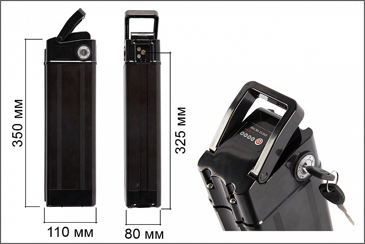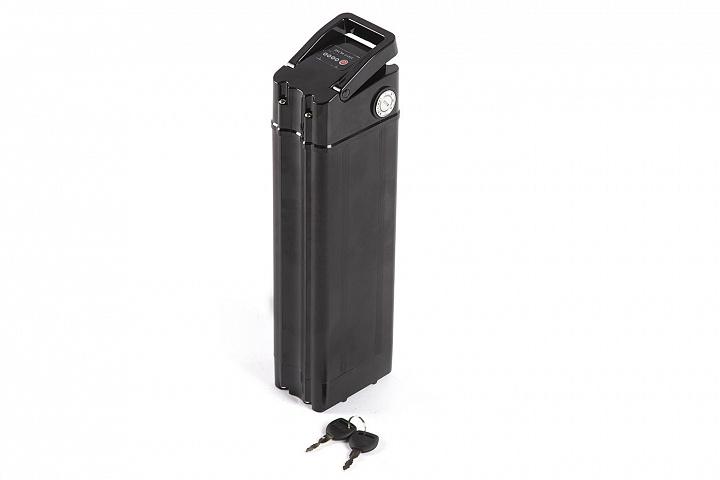 Аккумулятор собран в корпусе из алюминия, оснащается замком на ключе, который, кроме того что надежно фиксирует агрегат на направляющих посадочного места, также выполняет роль замка зажигания. Проверить уровень имеющегося заряда можно при помощи встроенного светодиодного индикатора, активировав его нажатием кнопки. Компактные размеры и небольшой вес позволили этой батарее стать оптимальным источником электроэнергии для многоцелевых электровелосипедов.