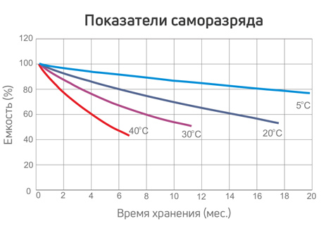 Конструкция аккумуляторной батареи Rutrike обеспечивает рекордно низкий для свинцовых аккумуляторов уровень саморазряда! Оптимальная температура хранения, как видно из графика, в районе +5 °С. При соблюдении условий саморазряд на 100% заряженной батареи в течение 20 месяцев снизится всего на 20%!