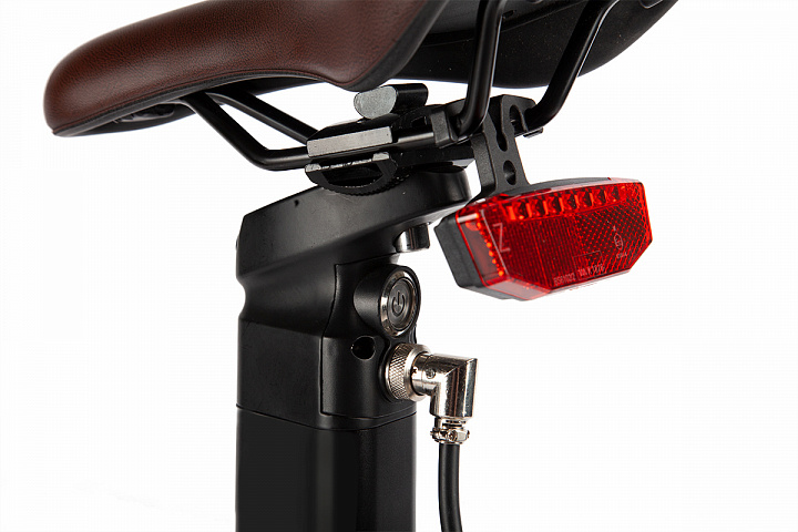 Аккумуляторная батарея на 36 вольт, ёмкостью 6,8 Ач, изящно встроенная в подседельный штырь с помощью запирающего механизма и эффектного крепления с хромированный разъёмом, обеспечивающим безопасное и надёжное соединение придаёт особое изящество дизайну велосипеда и приковывает к себе внимание!