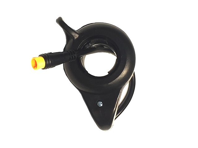 Данный курковый акселератор можно увидеть установленным на руле электросамоката Eltreco популярной серии Iconic. Самокаты с электроприводом модельного ряда Iconic получили заслуженно высокую оценку экспертов и поклонников персональной мобильности, благородя своим незаурядным техническим возможностям, надежности и удобству повседневного использования. Курок газа электросамоката, устанавливаемый на руле с правой стороны, позволяет обладателю этого транспортного средства комфортно и просто управлять работой мотор-колеса. Процесс набора скорости прост и интуитивен: при нажатии и удержании курка двигатель наращивает обороты, и скорость электросамоката возрастает. Для сброса скорости достаточно убрать палец с курка газа, и возвратная пружина вернет рычажок в исходное положение. За вычисление режимов эксплуатации и верные алгоритмы работы электродвигателя отвечает «мозг» самоката – контроллер. К этому главному узлу электрооборудования подключаются все органы управления, в том числе и курок газа, у которого на этот случай имеется встроенный кабель с разъемом, надежно защищенным от влаги и пыли.