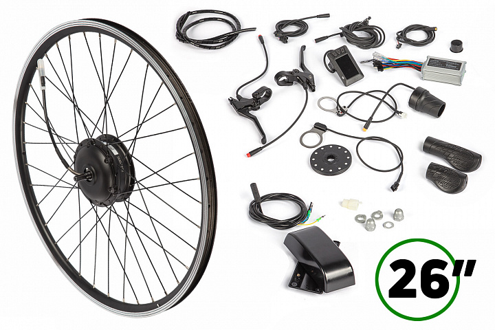 Наш набор включает в себя все необходимое для легкой и быстрой установки мотор-колеса на ваш велосипед. Комплект подойдёт для тех, кто хочет повысить комфорт и скорость передвижения, избегая лишних усилий при езде, при этом сэкономив средства на покупке готового электровелосипеда.